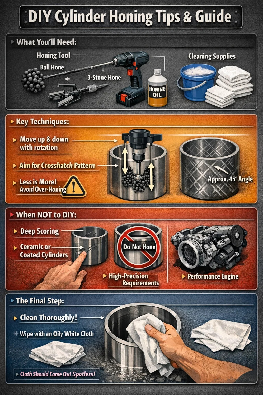 Less is more: The main purpose of DIY honing is to "clean the surface," not to "enlarge the bore." If you hone for too long, the cylinder may become oversized or oval, leading to leaks and oil burning later.