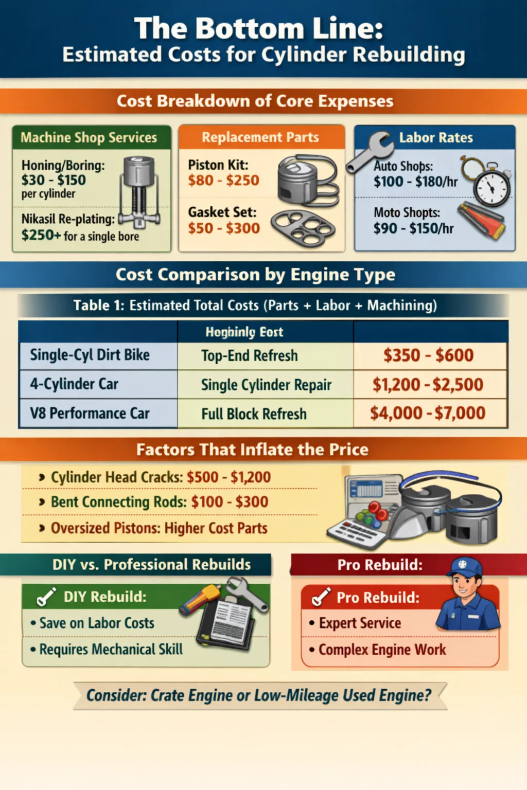 ค่าใช้จ่ายในการสร้างกระบอกสูบใหม่โดยทั่วไปมีตั้งแต่ 500 ถึง 1,500 เหรียญสหรัฐต่อกระบอกสูบ สำหรับเครื่องยนต์ของยานยนต์ในขณะเดียว กระบอกสูบรถจักรยานยนต์ มักจะสามารถรีเฟรชได้ในระหว่างนั้น 300 ดอลลาร์ และ $800 . ตัวเลขเหล่านี้จะแตกต่างกันอย่างมากขึ้นอยู่กับว่าคุณกำลังทำการรีเฟรช "ระดับบนสุด" (แหวนและปะเก็น) หรือการบูรณะเชิงกลทั้งหมดที่เกี่ยวข้องกับการคว้าน การคว้านกระบอกสูบ และลูกสูบขนาดใหญ่ หากคุณทำการรื้อถอนด้วยตัวเอง คุณจะประหยัดค่าแรงได้มาก ซึ่งโดยทั่วไปแล้วจะช่วยได้มาก 60% ถึง 70% ของใบแจ้งหนี้ทั้งหมด