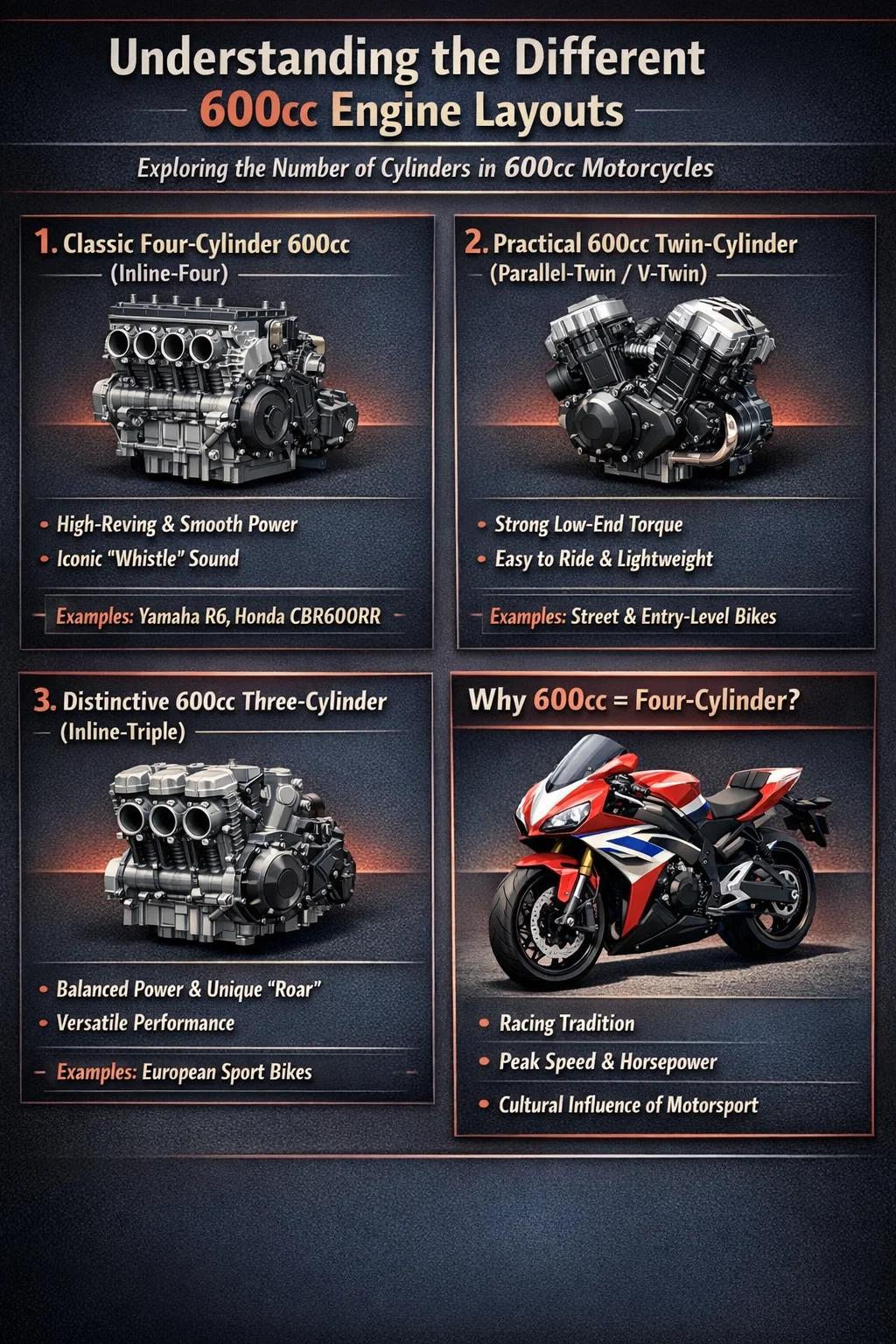 ต่อไปนี้เป็นข้อมูลเบื้องต้นโดยละเอียดเกี่ยวกับจำนวนกระบอกสูบและคุณลักษณะของเครื่องยนต์ 600cc: