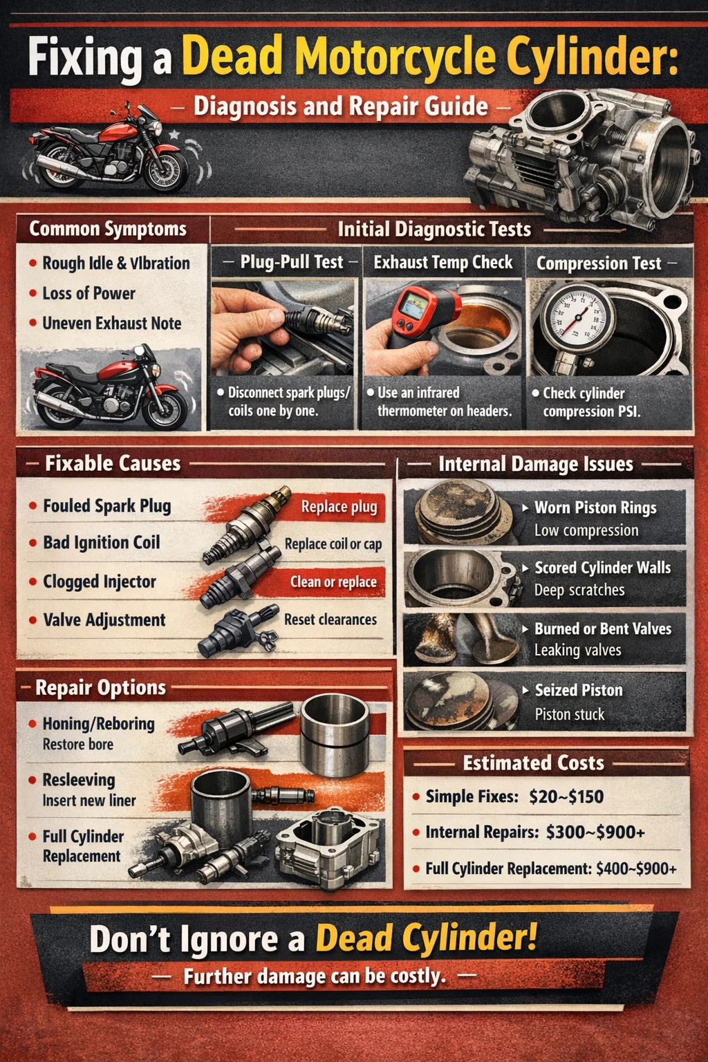 กระบอกสูบของรถจักรยานยนต์ที่เสียแล้วเนื่องจากหัวเทียนชำรุด หัวฉีดน้ำมันเชื้อเพลิงอุดตัน คอยล์จุดระเบิดไม่ทำงาน หรือปัญหาการปรับวาล์วเล็กน้อย สามารถฟื้นคืนชีพได้ด้วยการซ่อมที่ค่อนข้างตรงไปตรงมาและราคาไม่แพง ในอีกด้านหนึ่งของสเปกตรัม กระบอกสูบที่มีการเจาะเป็นรอย กระบอกแตก ลูกสูบยึด หรือการสึกหรอของแหวนอย่างรุนแรง จะต้องอาศัยการทำงานเชิงกลที่เกี่ยวข้องมากขึ้น ซึ่งรวมถึงการเปลี่ยนหรือการคว้านกระบอกสูบใหม่ด้วย ประเด็นก็คือ "กระบอกสูบตาย" ไม่ใช่การวินิจฉัยเพียงอย่างเดียว เป็นอาการที่ย้อนกลับไปถึงสาเหตุที่แท้จริงต่างๆ มากมาย โดยแต่ละสาเหตุมีเส้นทางการซ่อมแซมและค่าใช้จ่ายของตัวเอง