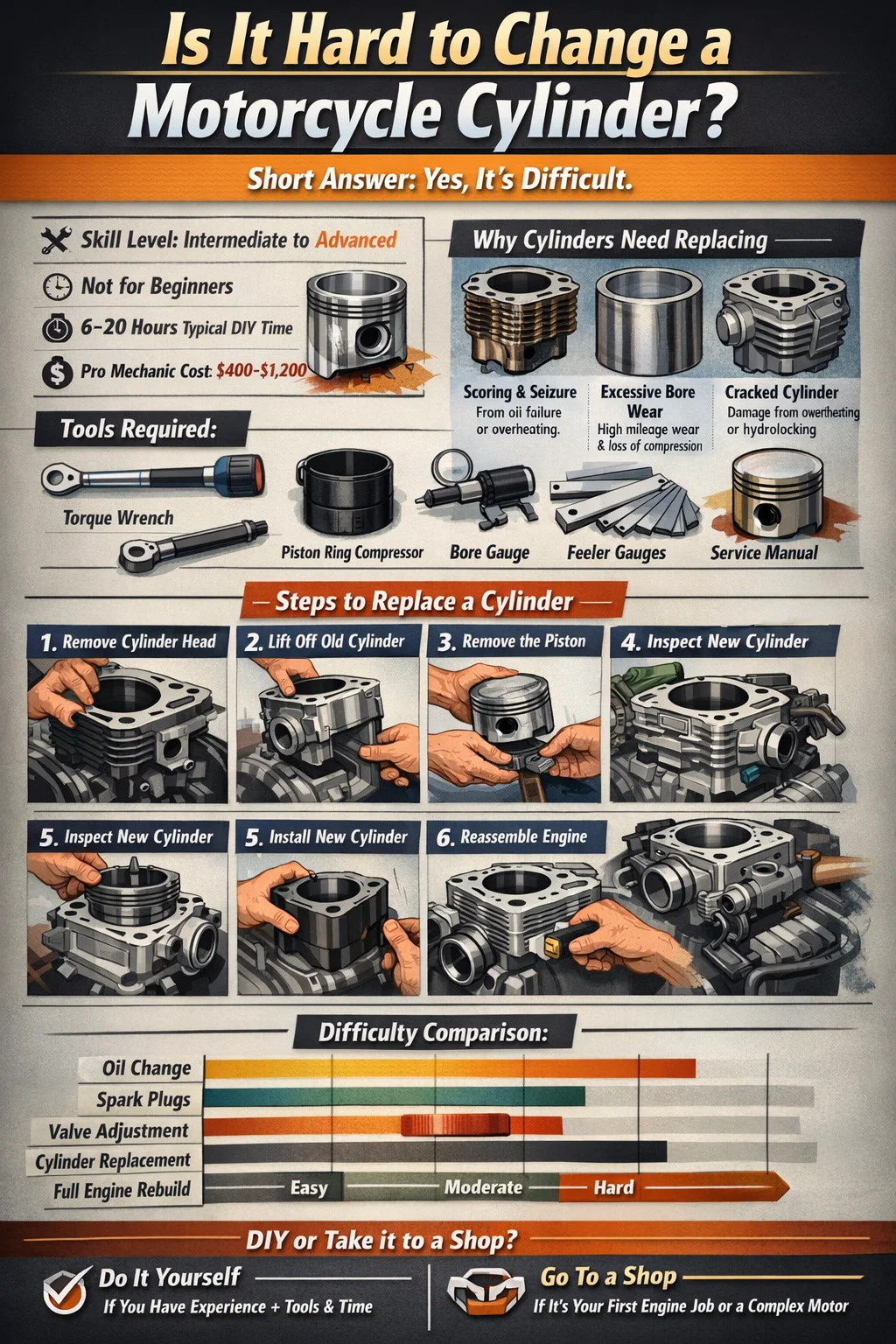 การเปลี่ยนกระบอกรถจักรยานยนต์นั้น ปานกลางถึงยากมาก ขึ้นอยู่กับการกำหนดค่าเครื่องยนต์ของจักรยานยนต์ ประสบการณ์ด้านกลไก และเครื่องมือที่คุณมี มันไม่ใช่งานระดับเริ่มต้น สำหรับผู้ขับขี่ส่วนใหญ่ที่ไม่มีประสบการณ์ในการสร้างเครื่องยนต์ใหม่มาก่อน กระบวนการนี้จะใช้เวลาตั้งแต่ต้นจนจบ 6 ถึง 20 ชั่วโมง กระจายไปหลายเซสชัน ช่างมืออาชีพมักจะเรียกเก็บเงินระหว่าง ค่าแรง $400 และ $1,200 เพียงอย่างเดียว ซึ่งจะทำให้คุณรู้สึกถึงความซับซ้อนที่เกี่ยวข้อง