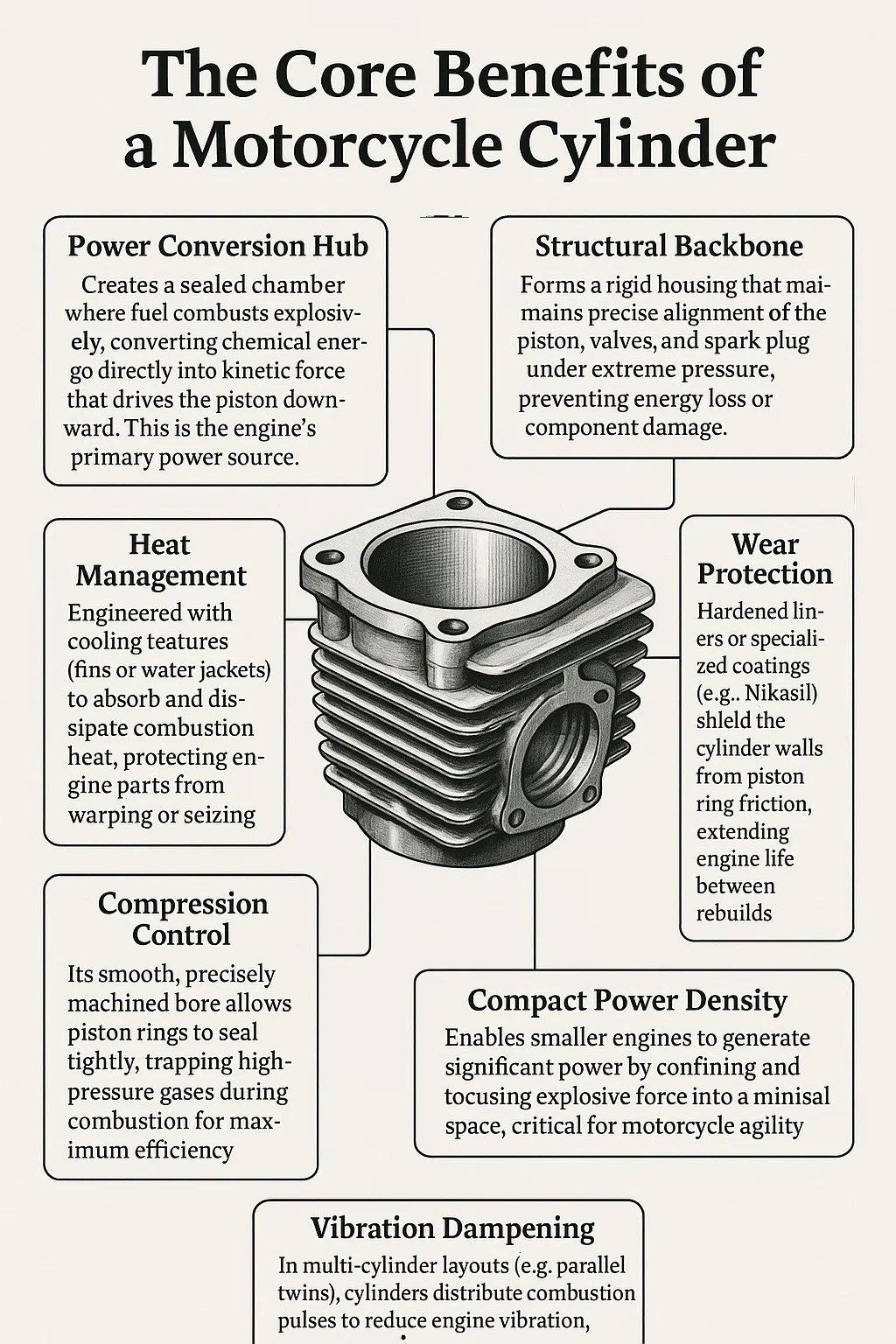 | การกระจายความร้อน | ครีบ (ระบายความร้อนด้วยอากาศ) หรือช่องจ่ายน้ำหล่อเย็น (ระบายความร้อนด้วยของเหลว) ดึงความร้อนออกจากการเผาไหม้อย่างรวดเร็ว | ปกป้องเครื่องยนต์จากความร้อนสูงเกินไปแม้ในขณะขับขี่อย่างหนัก |