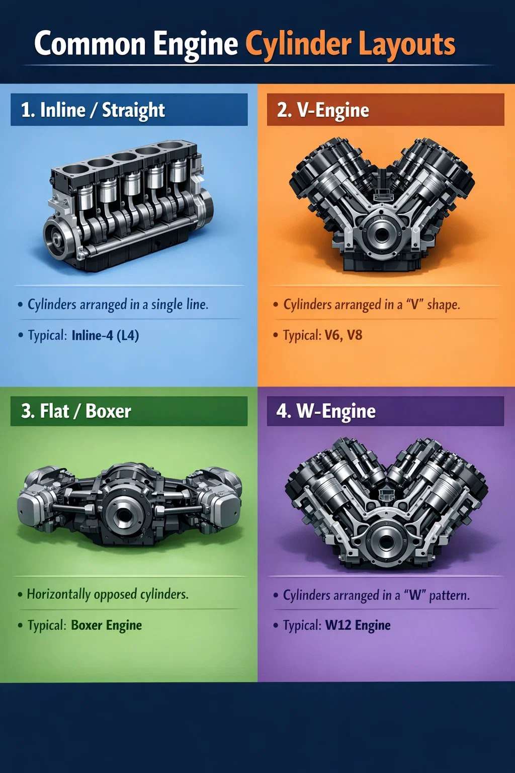 ต่อไปนี้คือรูปแบบการจัดเรียงกระบอกสูบที่พบบ่อยที่สุด:
