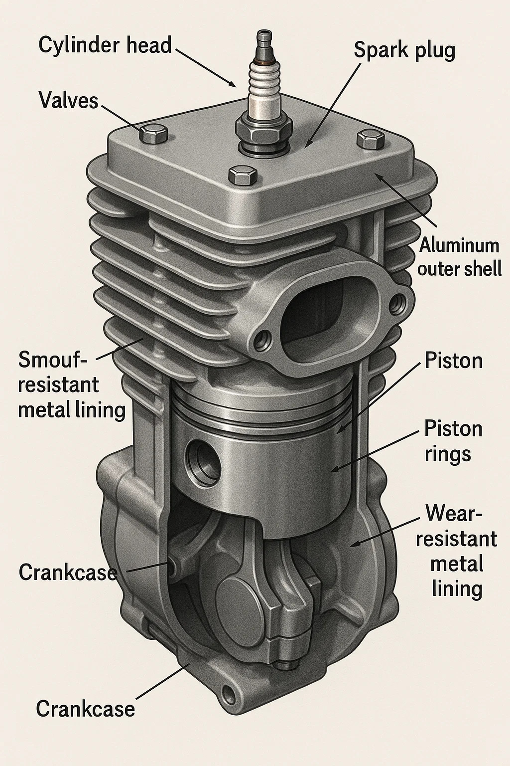 โดยทั่วไปมีเปลือกนอกอะลูมิเนียม (กระจายความร้อนได้อย่างรวดเร็วน้ำหนักเบา) โดยมีซับโลหะที่ทนทานต่อการสึกหรอภายใน (เช่นการเคลือบนิกเกิลซิลิกอนหรือซับเหล็ก) เพื่อป้องกันการสึกหรอจากลูกสูบ