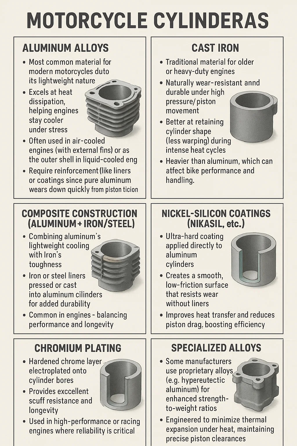 กระบอกสูบรถจักรยานยนต์ โดยหลักแล้วทำจากโลหะที่คัดเลือกมาเพื่อความแข็งแรง ทนความร้อน และความทนทาน ต่อไปนี้คือรายละเอียดโดยละเอียดของวัสดุทั่วไปและคุณลักษณะของวัสดุเหล่านี้: